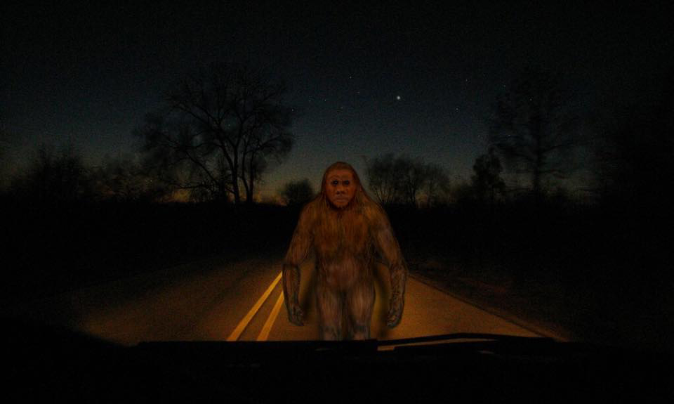 encounter, maybe 6 seconds. “I left work around 9:30pm and I was driving home. As I neared a small bridge that crossed a flowing ditch, I saw a black figure standing in the road in my lane so I immediately slowed down although I was not driving fast in the first place because of deer, and I was just relaxing and taking it easy after work so I was in no hurry. My first thought was, why was there someone dressed in dark clothing standing here in the road? As soon as I stopped within 12 feet of it, I knew immediately what I was looking at. Not a bear, not a human, but a young bigfoot. It was facing straight at me and in my full headlights. In my headlights its hair looked brownish/red and not black like when I first saw it at a distance. The single thing I was stricken with the most was its eyes. It looked like a scared child. It looked lost and confused. I suddenly felt sorry for it, in fact I felt worried for it. It looked straight into my eyes at 12 feet and it was a look of….What are you? Where did you come from?